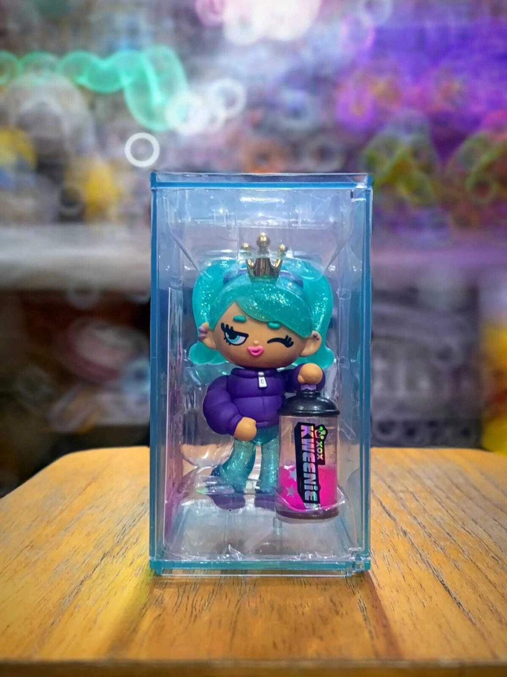 Con su pelo turquesa lleno de glitter, su corona, y una lata de aerosol gigante 🌈✨ llena pintura rosa, glitter y estrellas que se mueven al agitarla ⭐💫, ¡pura inspiración Kweenie!