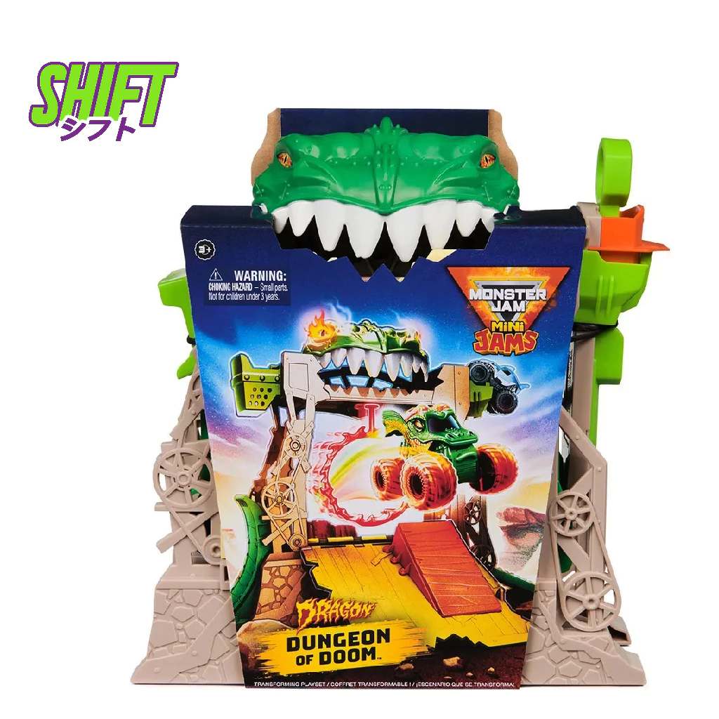 ¡Desata la intensa emoción del set Monster Jam, Dragon Dungeon of Doom! Sumérgete en la acción con el exclusivo Mini Jams Dragon Monster Truck a una impresionante escala 1:87.